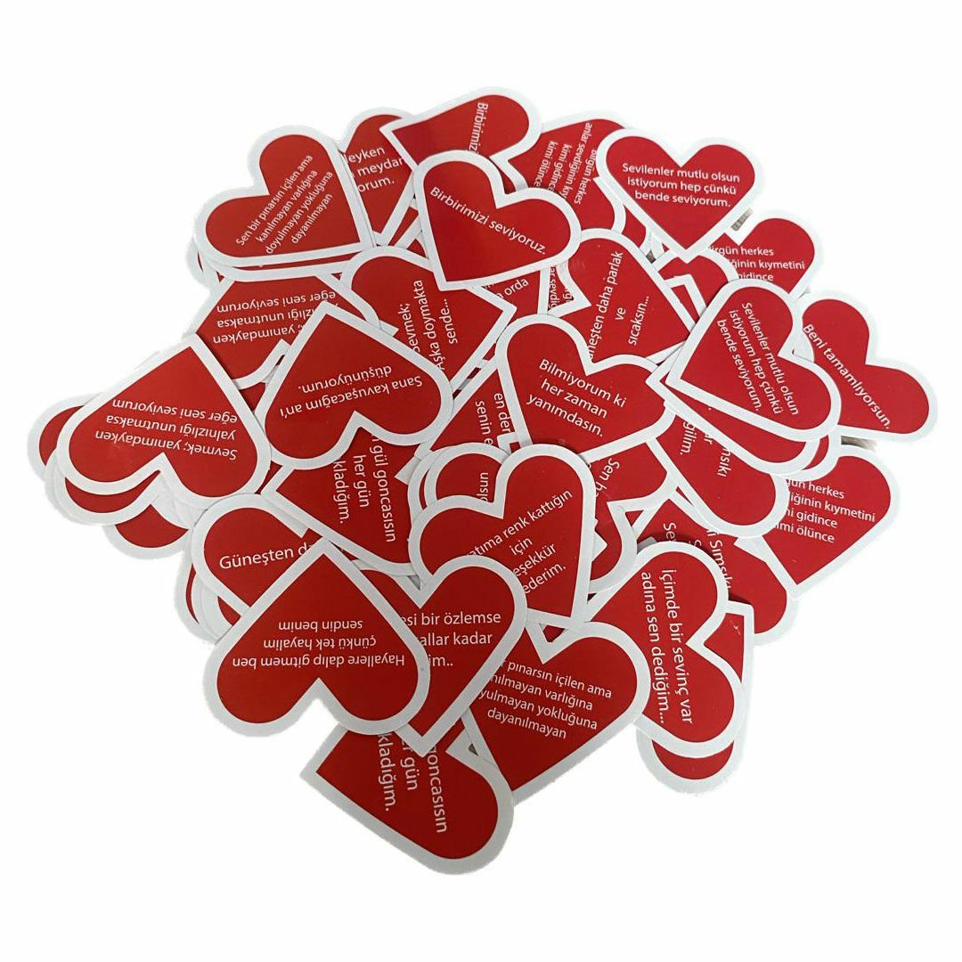365 adet Aşk Mesajı Sözleri kırmızı renkli ve kalp şeklindedir.