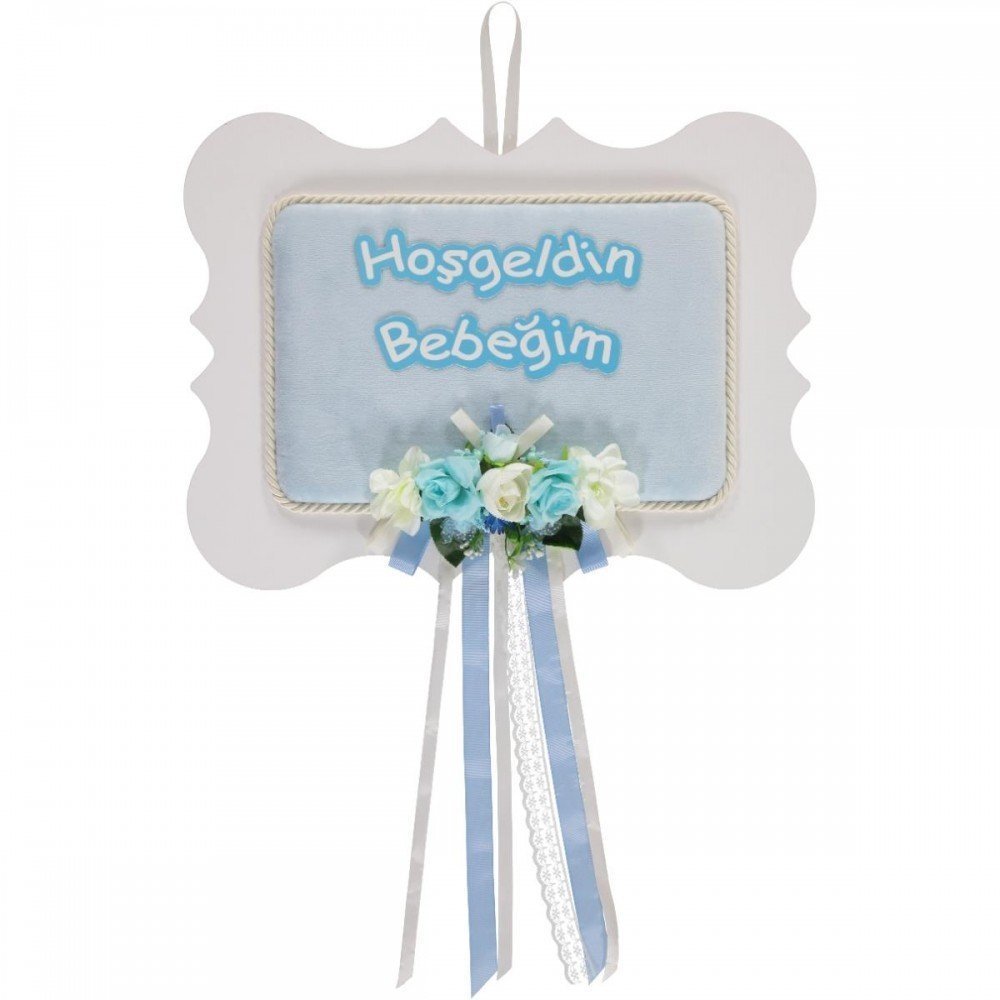 Ahşap Dikdörtgen Hoşgeldin Bebeğim Kapı Süsü Mavi
