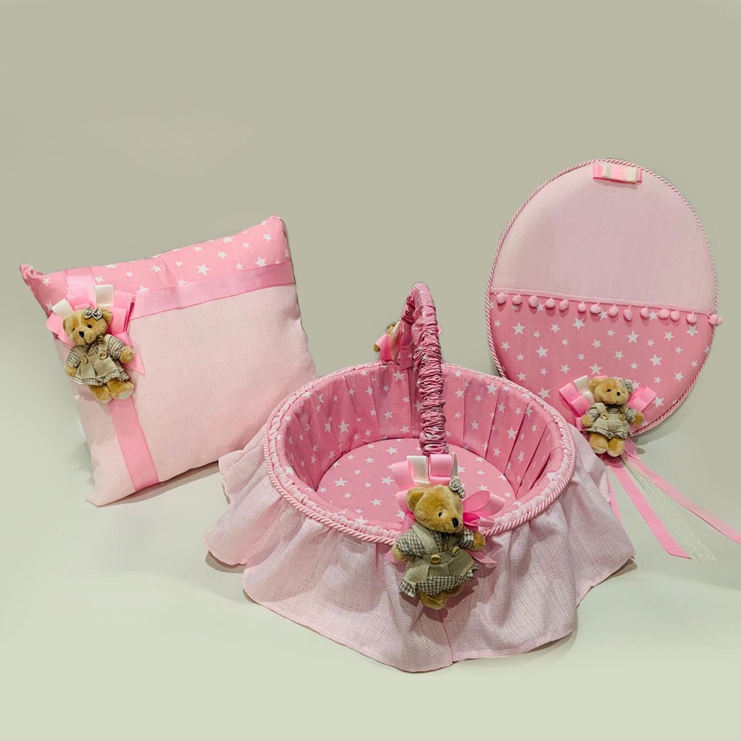 Ayıcıklı Pembe Bebek Kapı Süsü Yastık Sepet 3'lü Set