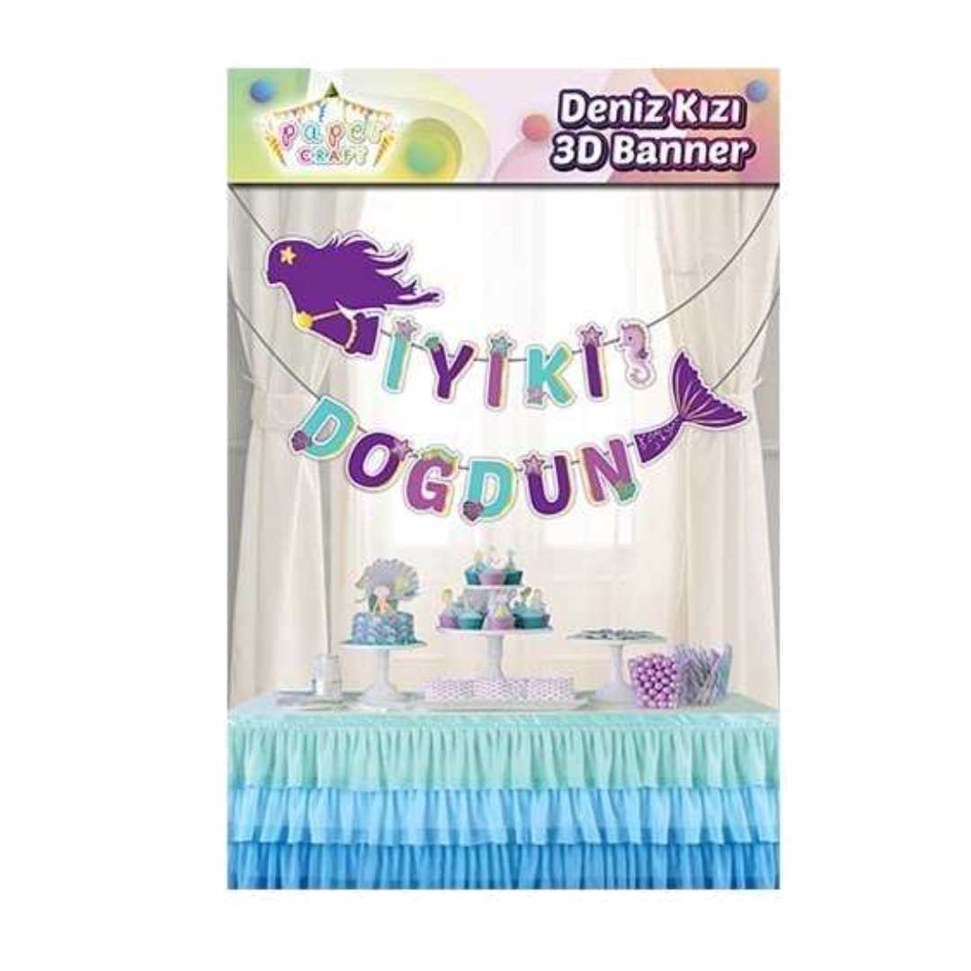 Kız çocuklarınız için hazırlayacağınız doğum günü partisinin vazgeçilmezi olacak deniz kızı 3D bannerı PartiPan.com'dan hemen satın alın!