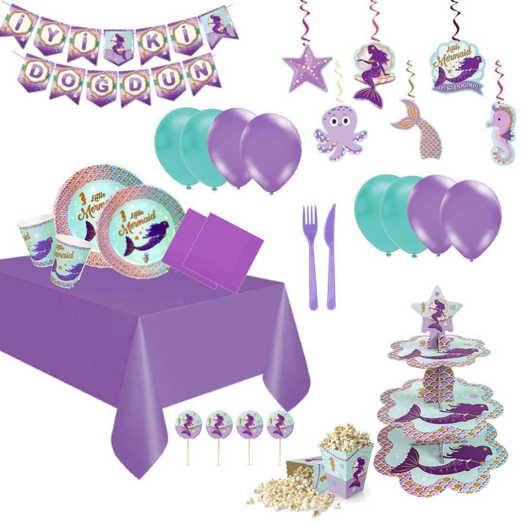 Lila ve trukuaz renklerden oluşan bu parıltılı deniz kızı doğum günü seti zengin süsleme malzemelerinden oluşmaktadır.
