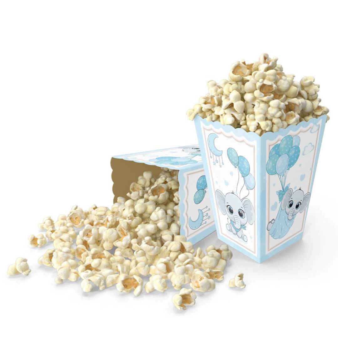 Doğum günü partileri ve Baby Shower partileri için özel olarak üretilmiş ikramlıklarınızı şık bir şekilde sunabileceğiniz mavi fil temalı mısır kutusu.