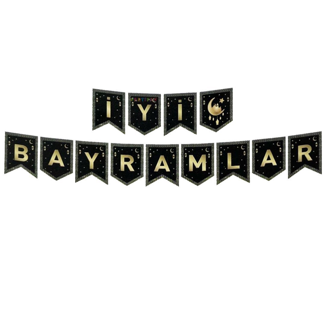 Siyah üzerine gold yazılı Zikzak İyi Bayramlar Banner. Bayram sofralarınızın arkasına,perdeye,duvara içerisinde bulunan ip yardımı ile asabilirsiniz. Her bir harfin eni:13.5 cm boyu:17 cm'dir.