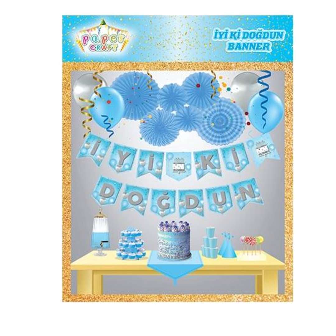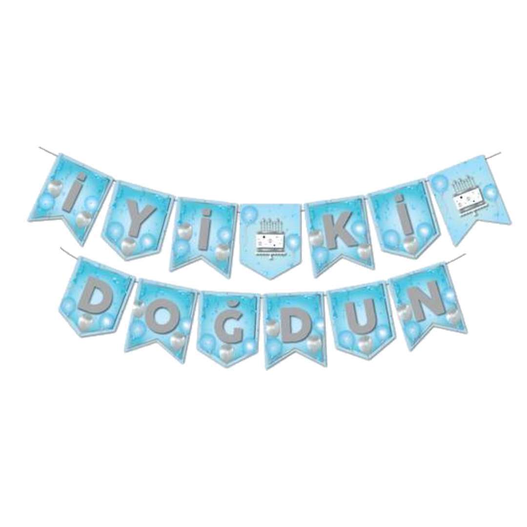 Kaliteli kağıttan üretilmiş doğum günü süsü, mavi zemin üzerine gümüş renk harflerle İyi ki doğdun yazılmıştır.