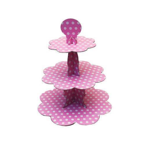 Pembe renkli Beyaz puantiyeli kek standı 3 katlıdır.