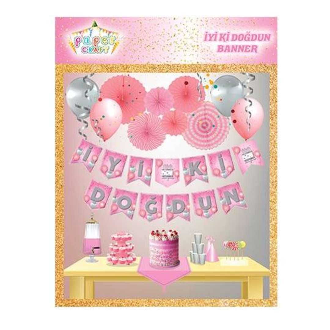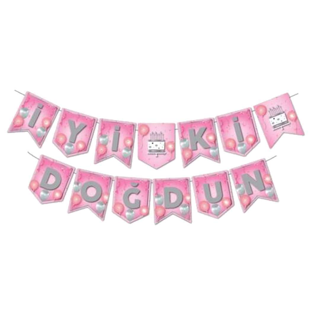 Kaliteli kağıttan üretilmiş doğum günü süsü, pembe zemin üzerine gümüş renk harflerle İyi ki doğdun yazılmıştır.