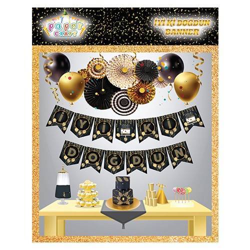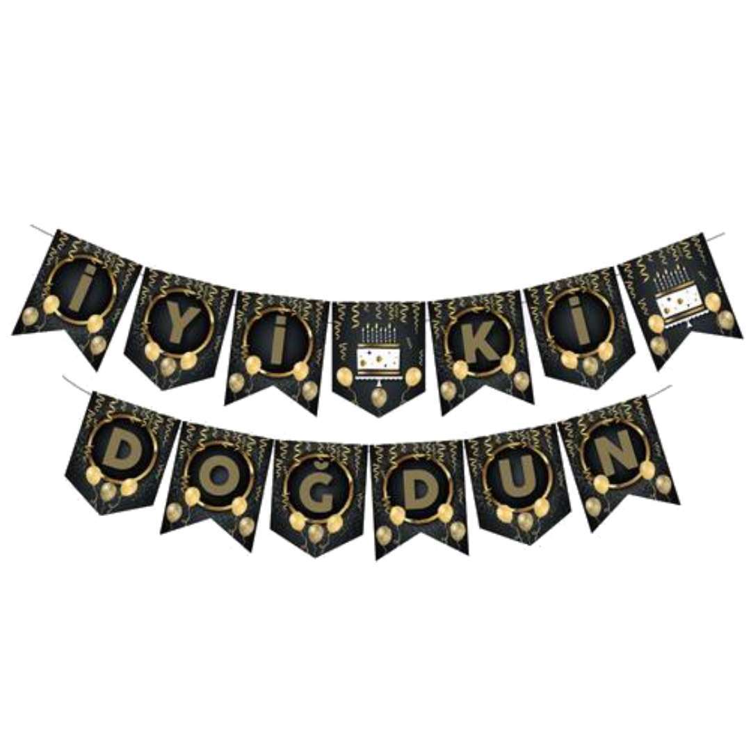 Kaliteli kağıttan üretilmiş doğum günü süsü, siyah zemin üzerine altın renk harflerle İyi ki doğdun yazılmıştır.